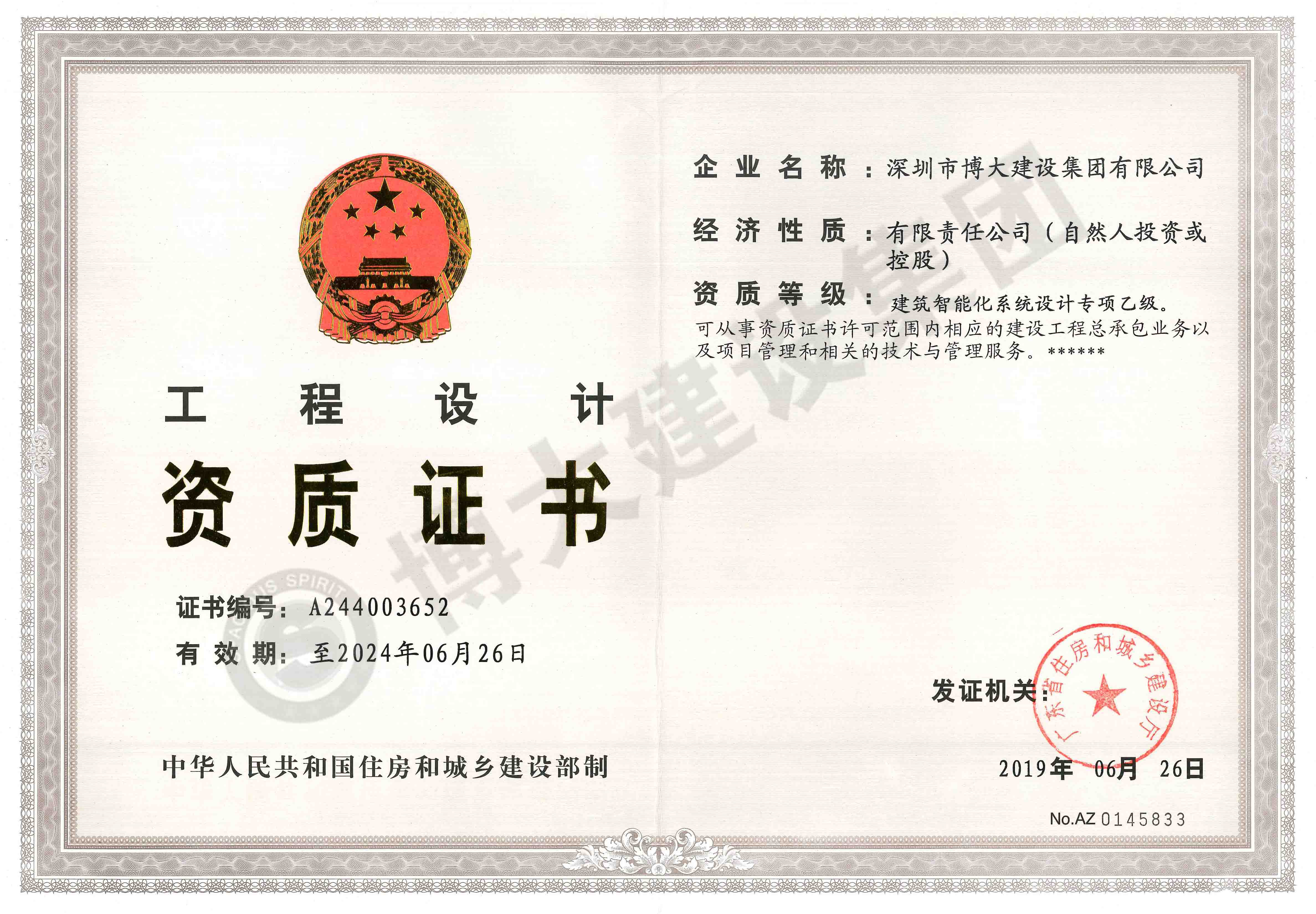 博大資質(zhì) | 喜獲建筑智能化系統(tǒng)設計專項乙級