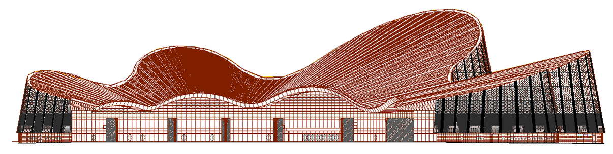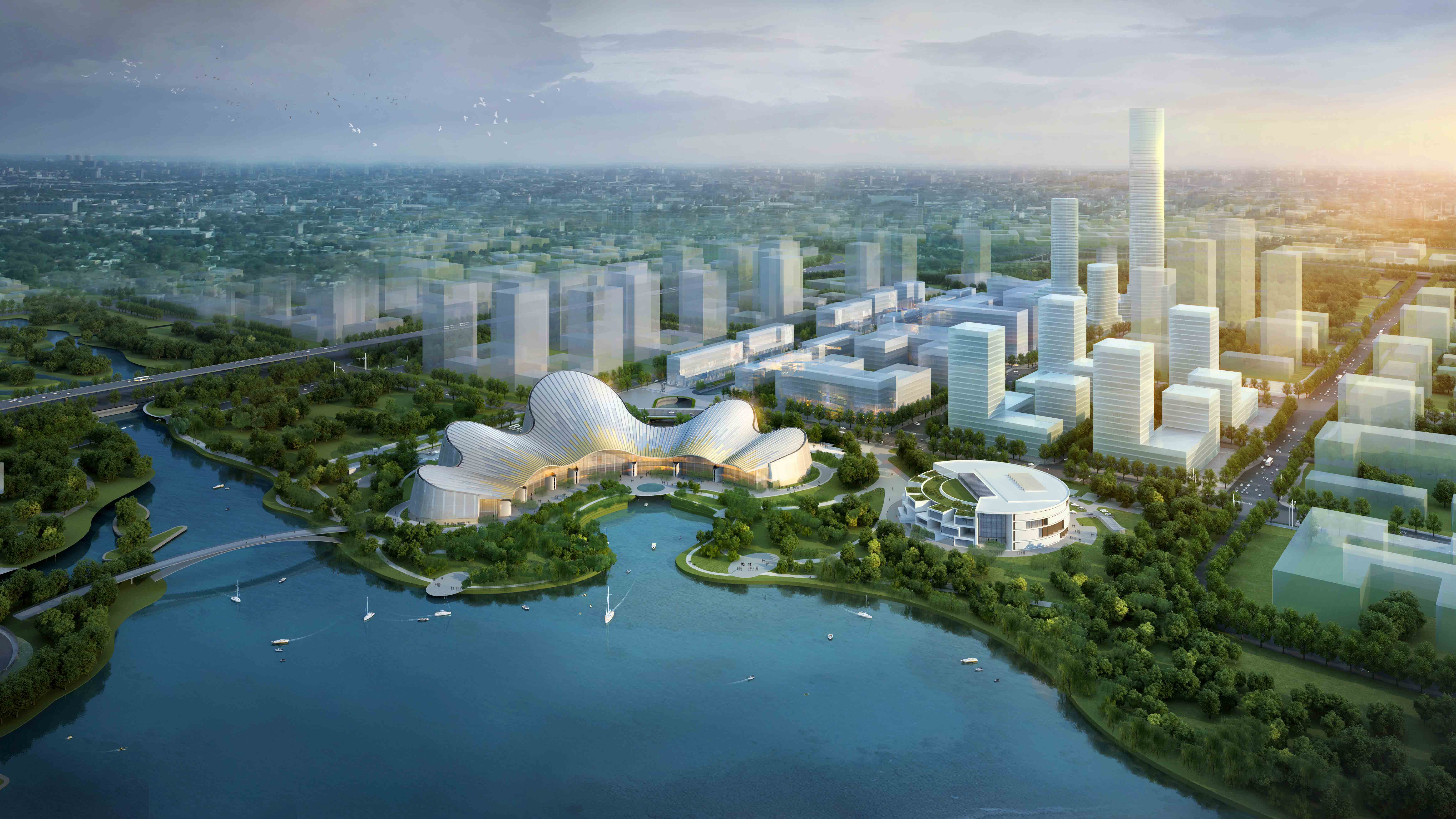 大劇院沿湖一側,起伏的屋面,舒展流暢,宛如兩架協奏的鋼琴,樂聲悠揚。又如一只翩翩起舞的紙鸞乘風欲起。