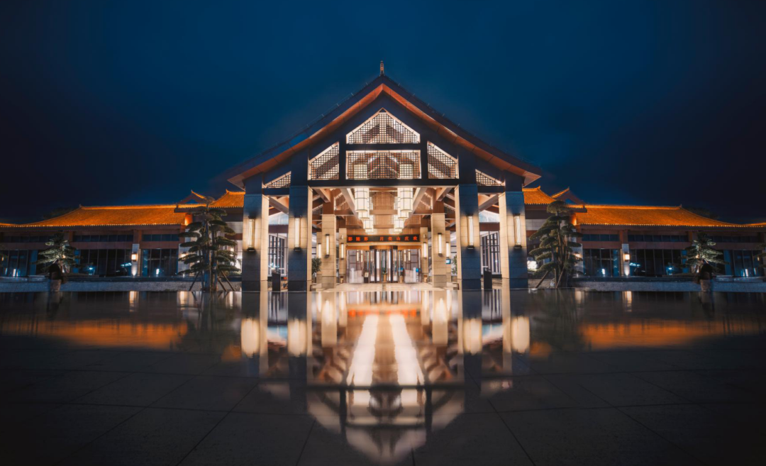 9#樓與8#樓互成犄角之勢,主要功能為酒店大型宴會之所,同樣為扇形建筑體、網(wǎng)架鋼結(jié)構(gòu)屋面。通透的山水畫沖孔鋁單板輔以木紋造型鋁板包梁,述說著貴州山水的靈性,也貫穿延續(xù)了整體建筑風(fēng)格。