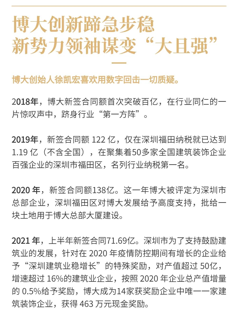 10年時(shí)間,博大業(yè)績實(shí)現(xiàn)了從10億到138億的高速增長,從默默無聞到行業(yè)知名,屢屢創(chuàng)造發(fā)展奇跡。2019年成為深圳市福田區(qū)行業(yè)排名第一的納稅大戶;2020年成為深圳市總部企業(yè);2021年榮獲深圳市政府建筑業(yè)穩(wěn)增長獎(jiǎng)勵(lì),成為行業(yè)唯一一家獲此殊榮的裝飾企業(yè)。