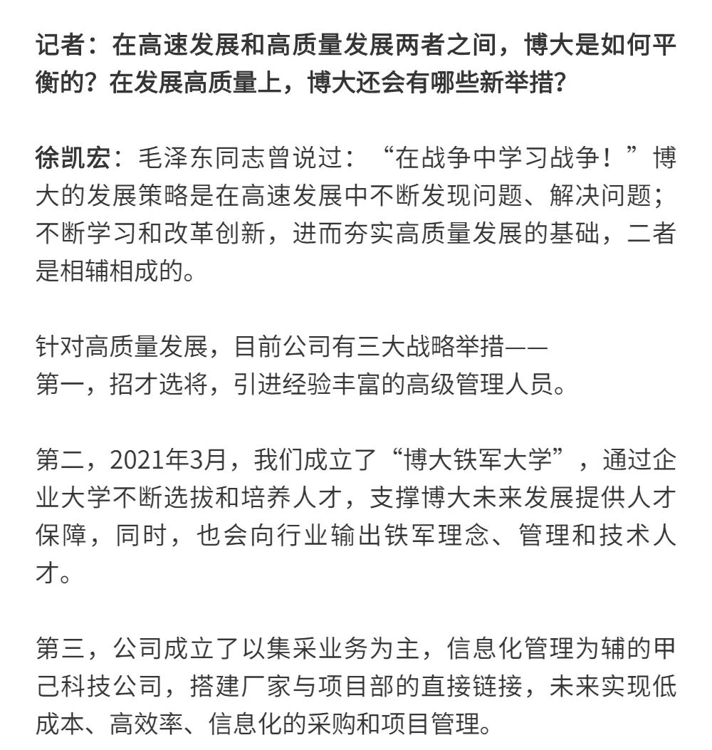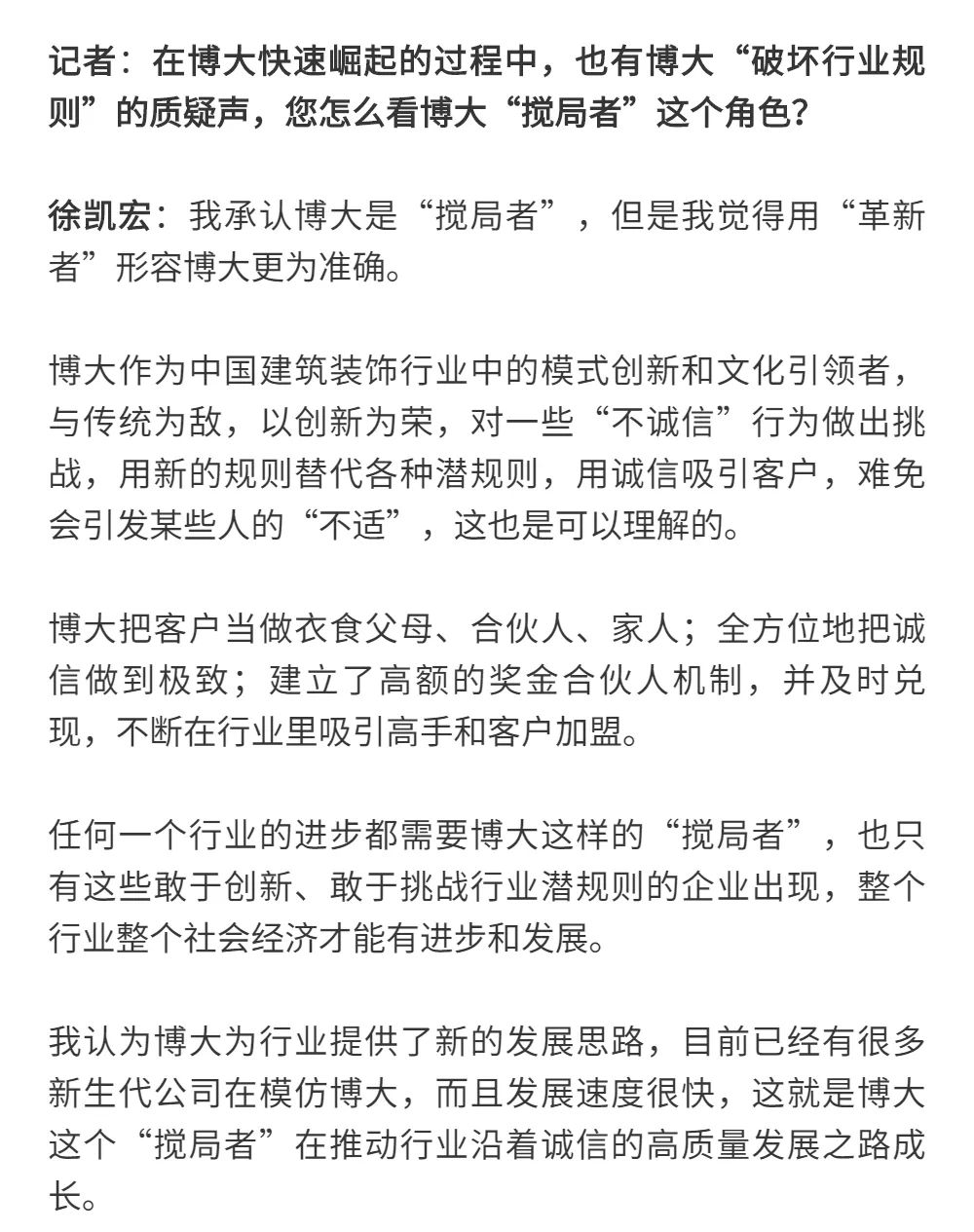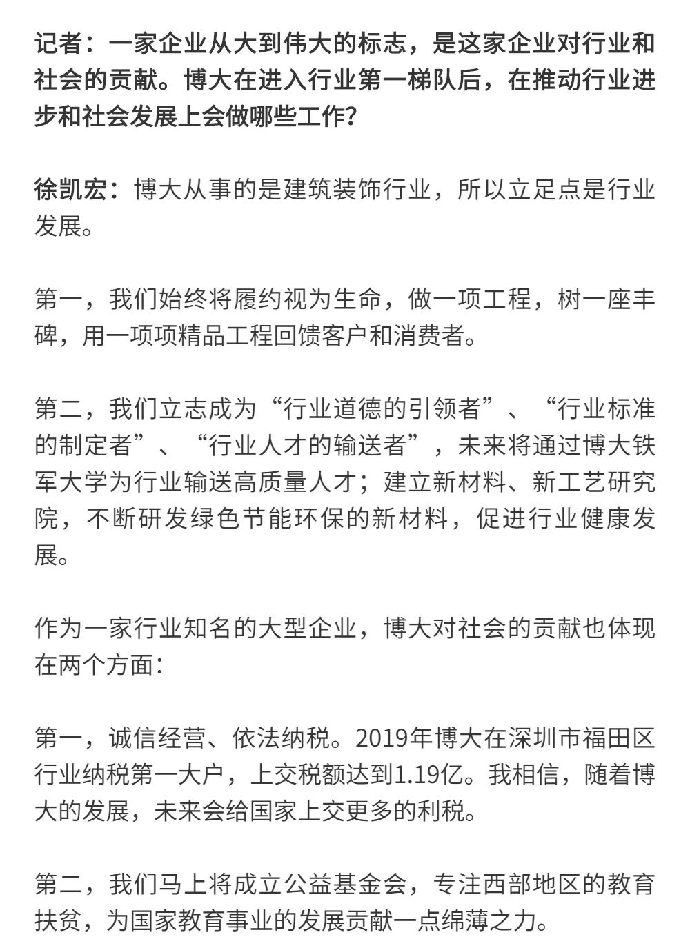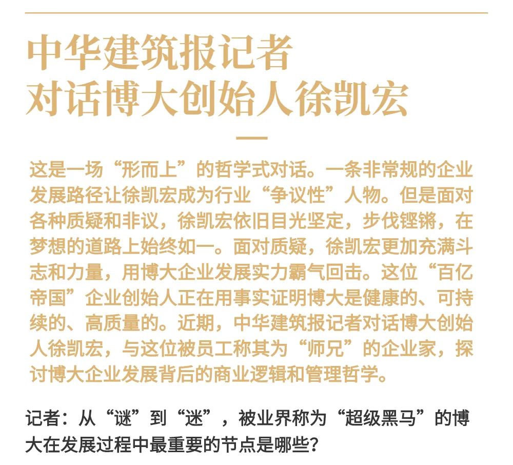 博大以雷霆之勢迅速崛起,吸引了行業(yè)的高度關(guān)注,行業(yè)權(quán)威媒體《中華建筑報(bào)》數(shù)次深入博大一線調(diào)研走訪,并對(duì)創(chuàng)始人徐凱宏先生進(jìn)行了坦誠的訪談,以探討和總結(jié)博大發(fā)展的秘籍,并寫就了《進(jìn)擊的博大:從高速到高質(zhì)量的創(chuàng)新逆襲》和《對(duì)話徐凱宏 | 博大正沿著高質(zhì)量發(fā)展道路堅(jiān)定前行》兩篇文章。