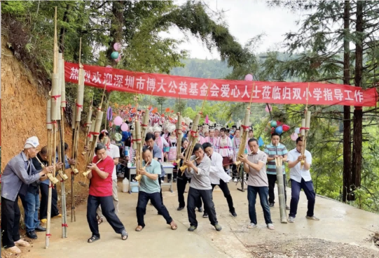 4月21日至22日,深圳市博大公益基金會理事長、集團董事長張炳來前往貴州省黎平縣實地考察擬捐建學(xué)校場地,并回訪2021年交付當(dāng)?shù)卣褂玫膭?wù)孖小學(xué)。當(dāng)?shù)厝罕娸d歌載舞,熱烈歡迎理事長張炳來的到來。
