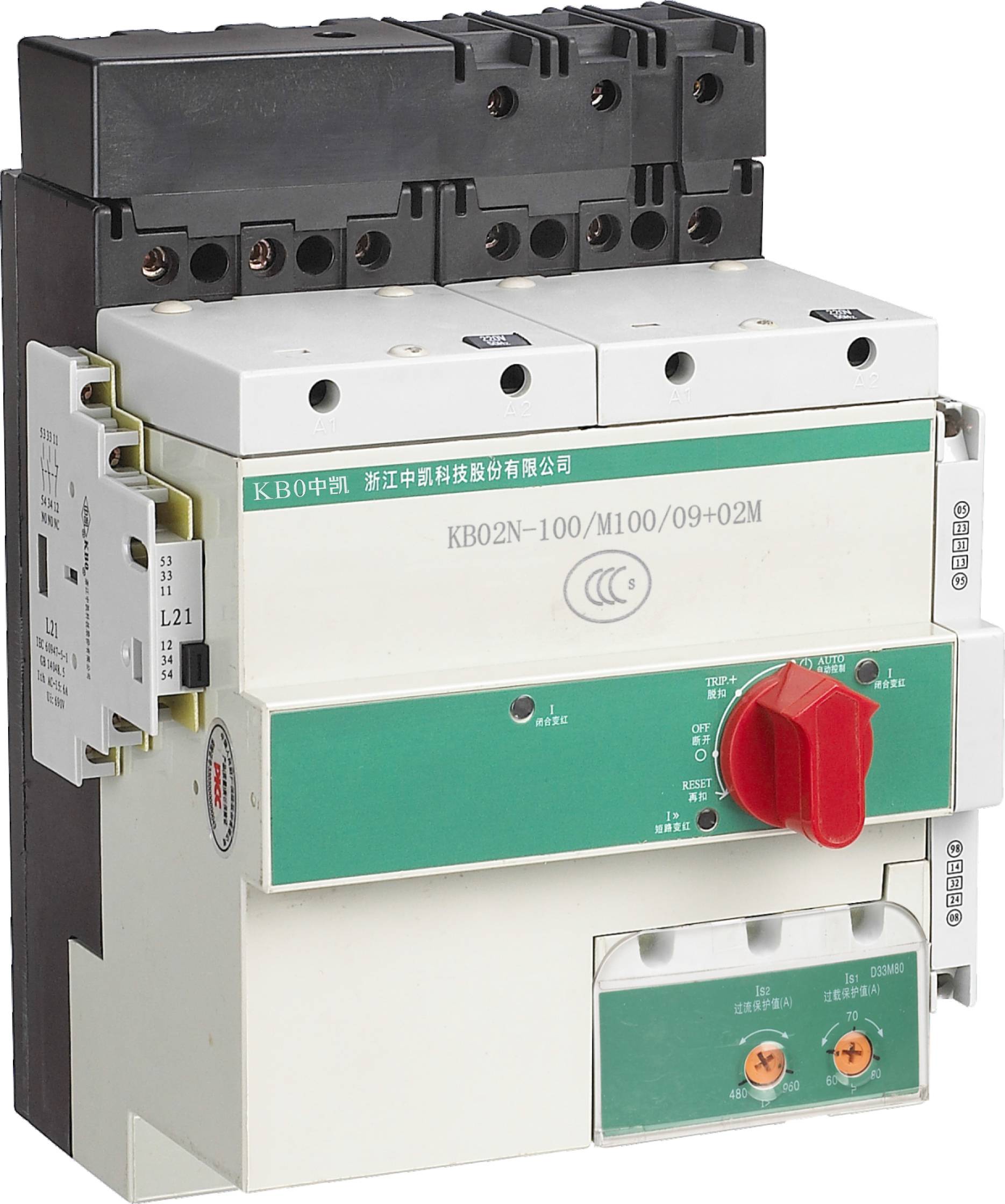 由兩臺KB02基本型產品主體,通過增加切換機械聯鎖、電氣聯鎖、相序切換銅排、輔助模塊等附件組成,構成了可逆電動機控制與保護開關電器。可逆型開關電器,主要通過外部控制回路,實現電源至電動機的相序改變,從而實現電動機的正、反轉控制。